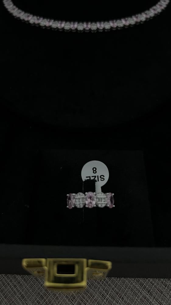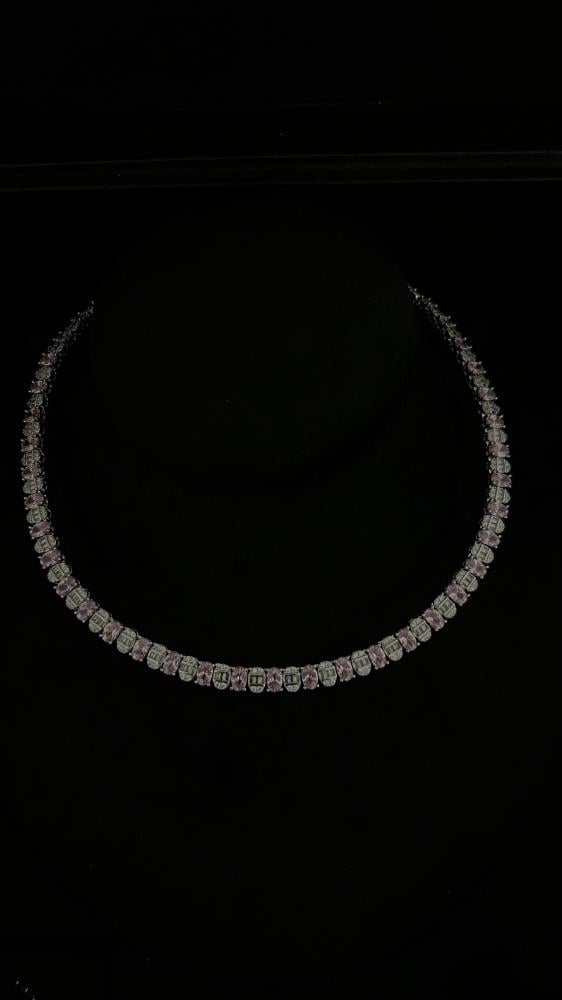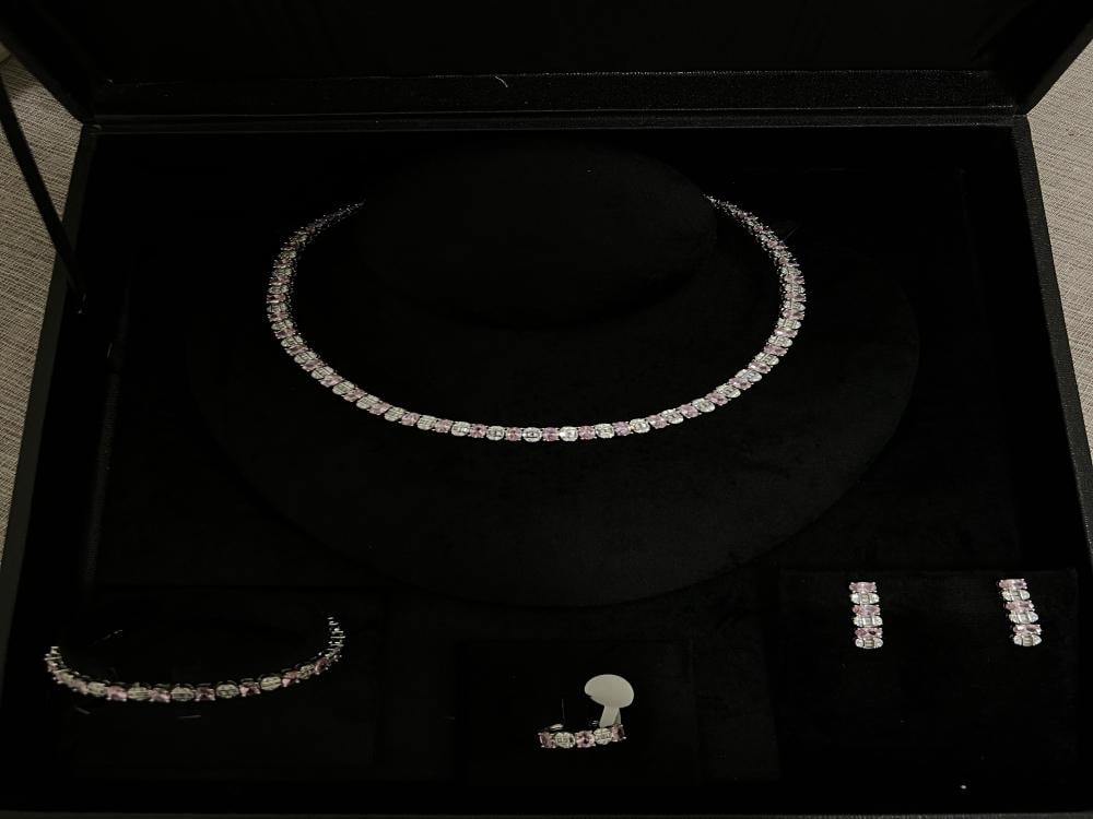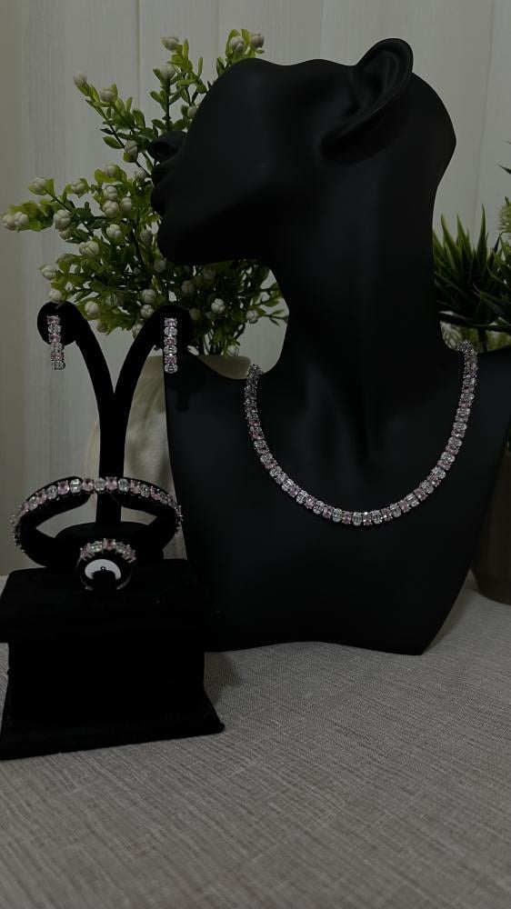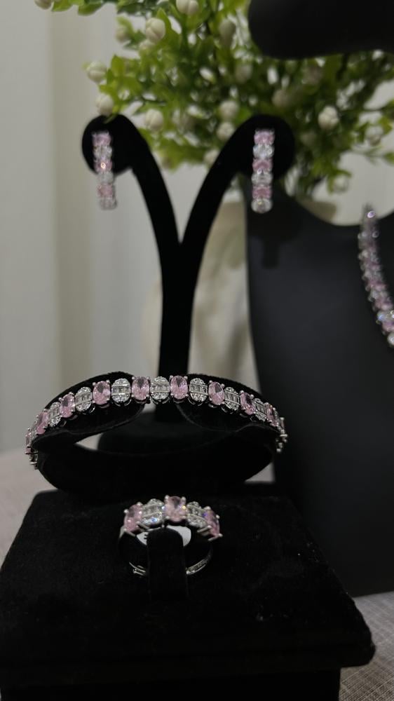 طقم أنيق بتصميم الماس، ب حبات الألوان الزهريه الانيقه مصنوع بعناية ليجمع بين البريق الفاخر والتصميم العصري، مما يجعله الاختيار المثالي لإطلالة متكاملة تخطف الأنظار في الحفلات والمناسبات الخاصة.